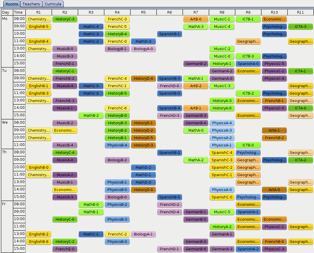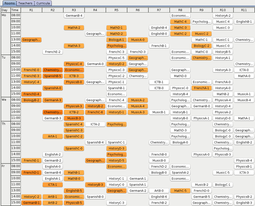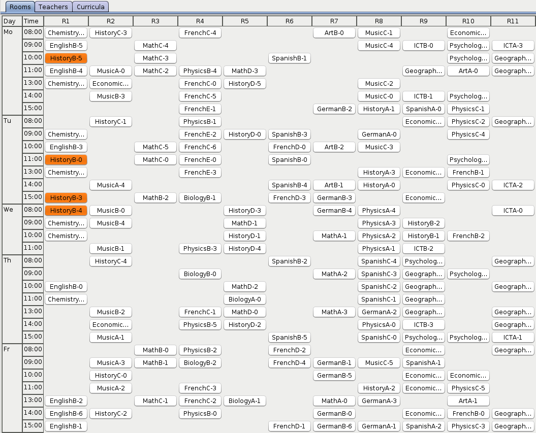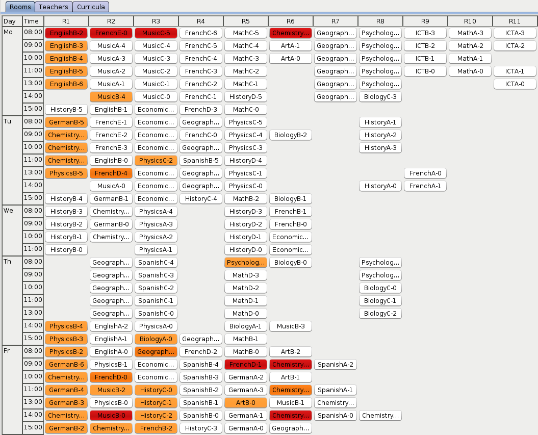 As OptaPlanner finds better and better solutions, there is less and less orange on the heat map. Looks like the history courses are particularly hard to schedule. Maybe the school should look for an additional history teacher?